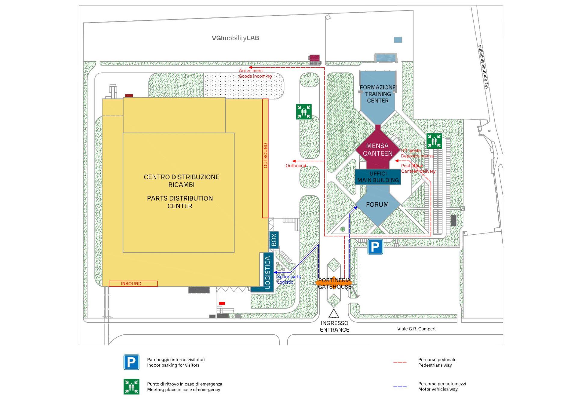 A visit to the Spare Parts Distribution Centre is only possible if accompanied by employees of Volkswagen Group Italia S.p.A.. When moving around in this area, you must respect the marked pedestrian paths and follow the instructions of the accompanying person. In particular, we invite you to pay particular attention when crossing the road, given the presence of moving forklifts.
