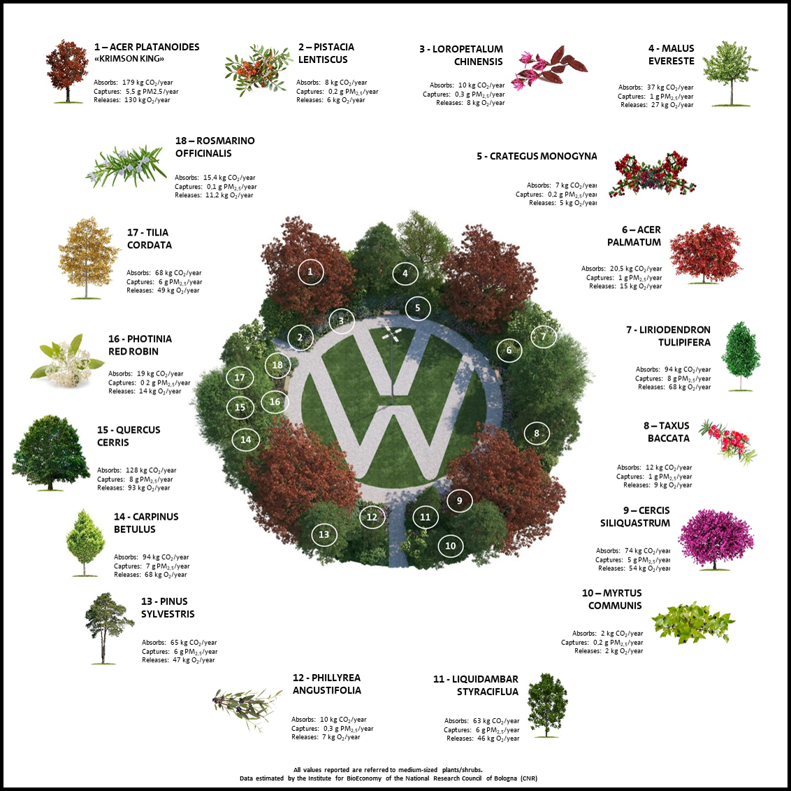 The OXYGEN AREA has 324 between trees and shrubs that, once fully grown and in full activity, every year – together with lawn’s 170 square meters – will be able to absorb 7,054 kg of CO2 and 22 kg of pollutants and to produce 5,000 kg of oxygen. The evaluation is based on the i-Tree Eco model, developed by the Forest Service of the United States Department of Agriculture (USDA) and implemented by IBE-CNR for adaptation to local Italian microclimatic conditions; the calculation is carried out on the basis of plant size and environmental conditions.