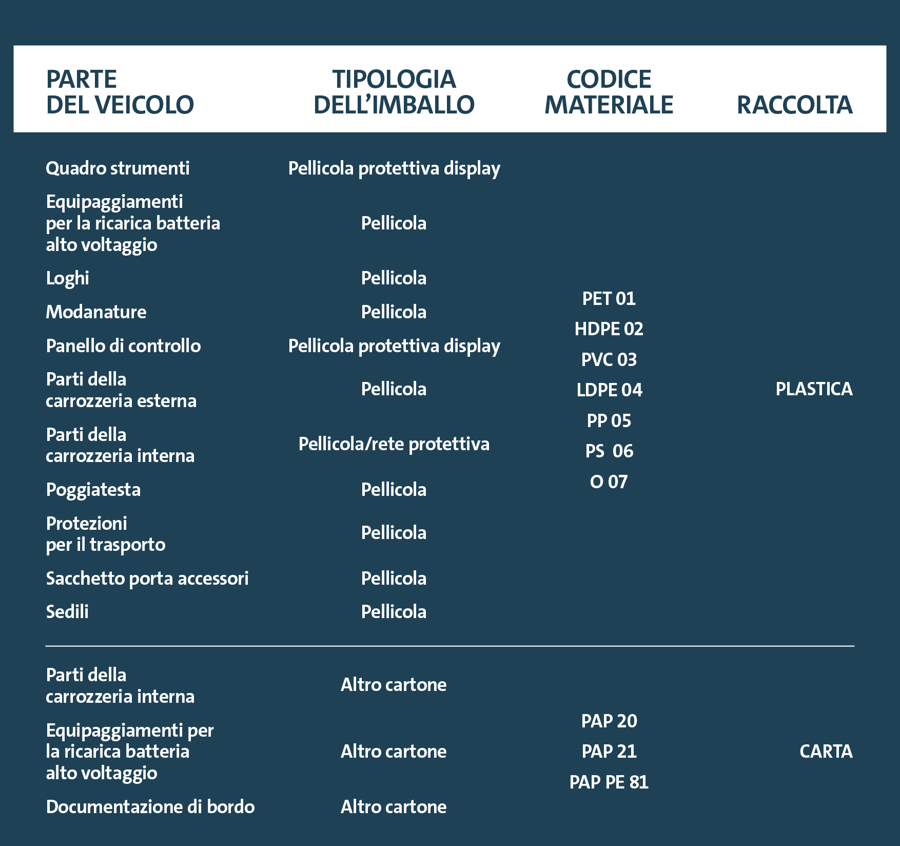 Gli imballi utilizzati per la protezione dei veicoli nuovi sono costituiti dai seguenti materiali: