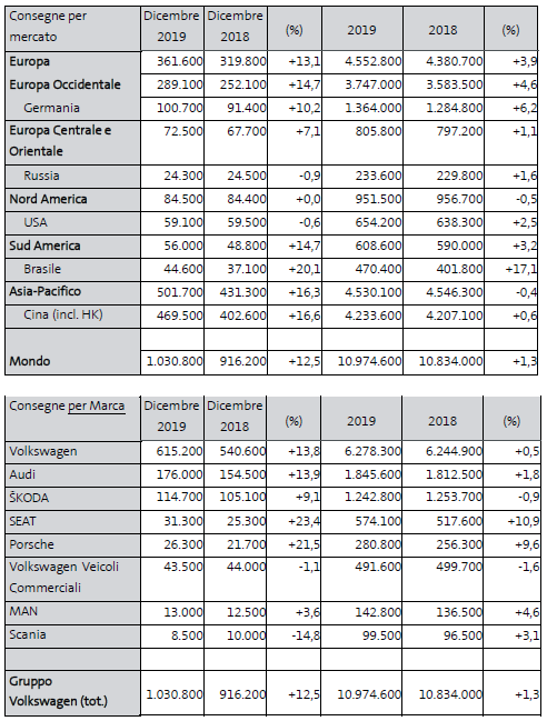 Nonostante la contrazione generale dei mercati, nel 2019 il Gruppo Volkswagen ha fatto segnare una crescita delle consegne nel mondo dell’1,3%, con 10.974.600 veicoli. Le quote di mercato sono aumentate in tutte le regioni, in alcuni casi in modo significativo. Sono stati registrati un incremento dei volumi in Europa (+3,9%) e in Sud America (+3,2%) e un lieve calo in Nord America (-0,5%) e nell’area Asia-Pacifico (-0,4%). In forte crescita i veicoli elettrici: i molti modelli lanciati nell’ambito dell’offensiva elettrica del Gruppo e il maggior interesse da parte dei clienti hanno portato a un +80% circa, con oltre 140.000 unità.