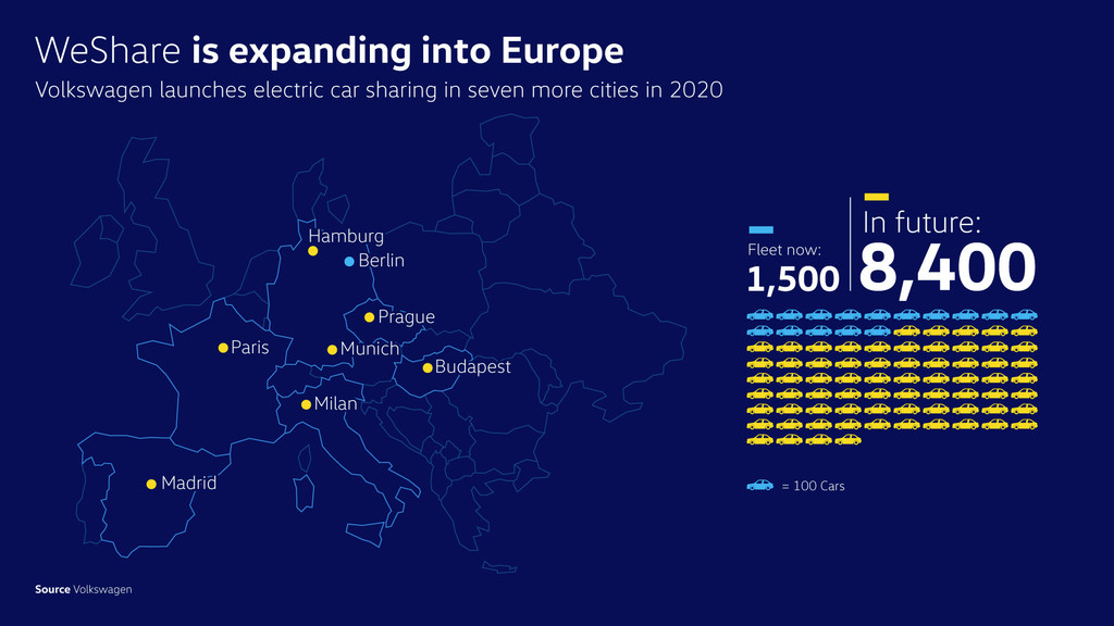 WeShare, il servizio di car sharing a flusso libero Volkswagen e ŠKODA, nel 2020 sarà introdotto in altre sette città fra Germania e altri Paesi europei: Praga e Amburgo in primavera, seguite da Parigi, Madrid, Budapest, Monaco e Milano nel corso dell’anno. In ognuna WeShare metterà a disposizione una flotta 100% elettrica – per un totale di 8.400 veicoli a zero emissioni. A Praga e a Budapest WeShare collaborerà con ŠKODA. Nelle altre città in Germania, Francia, Spagna e Italia l’offerta di veicoli includerà Volkswagen e-Golf 1 ed e-up! 2, e la ID.3 3 dalla fine dell’anno. WeShare ha già avviato le operazioni a Berlino nel 2019 con 1.500 e-Golf e al momento conta 50.000 utenti iscritti.